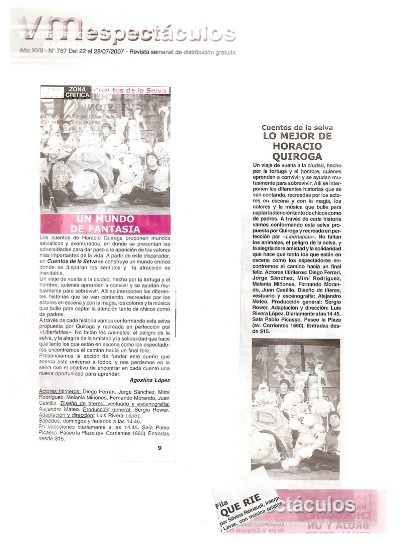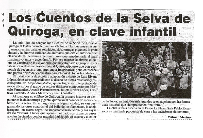Tomando como base cuatro famosísimos "cuentos de la selva" de Horacio Quiroga: "La tortuga gigante", "El baile de los flamencos", "La abeja haragana" y "El paso del Yabebirí", LIBERTABLAS elabora una gran producción tan llena de colores, matrices y vida como la selva misma. La amistad, el valor, la resistencia y la solidaridad son solo algunos de los valores exaltados por el texto original que, de la mano de actores, títeres de las más variadas técnicas, una música omnipresente y una escenografía sorprendente, llenan el escenario creciendo como los matorrales al borde de los ríos, transportándonos al mundo natural en el que los animales actúan como humanos y los humanos se acercan al universo animal para reconocerse en él.